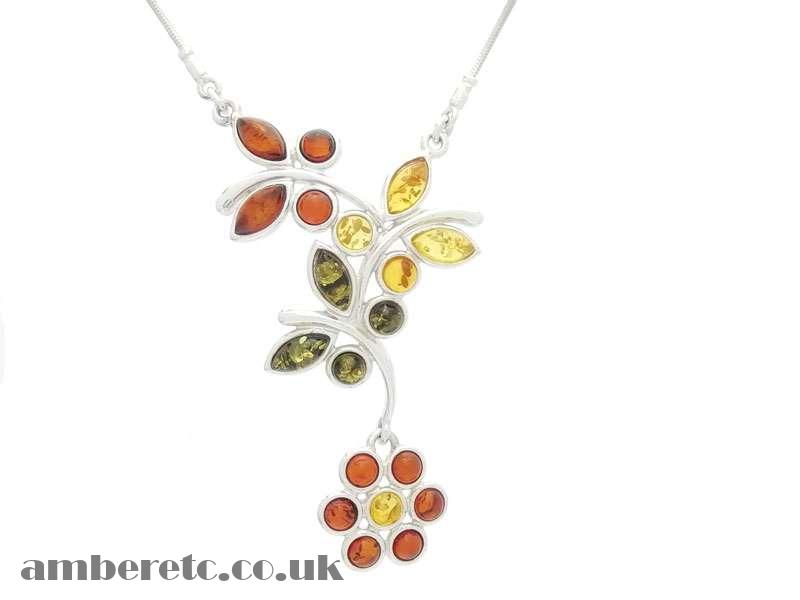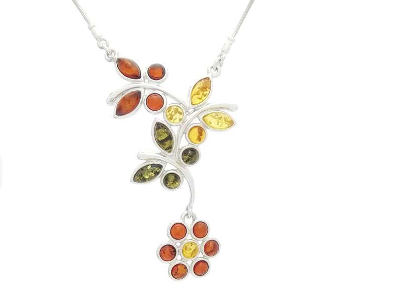 Beautiful 925 Sterling Silver Butterfly and Flower Necklace with Multicoloured Baltic Amber.