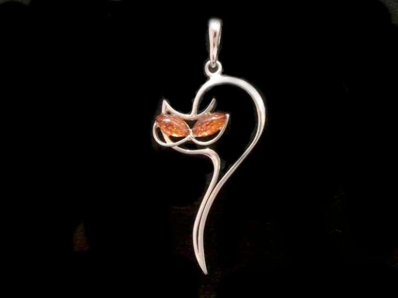 Beautiful 925 Sterling Silver Stretching Cat Pendant with Natural Baltic Amber.