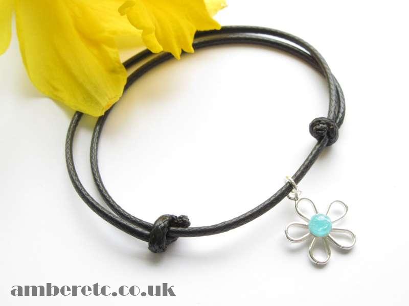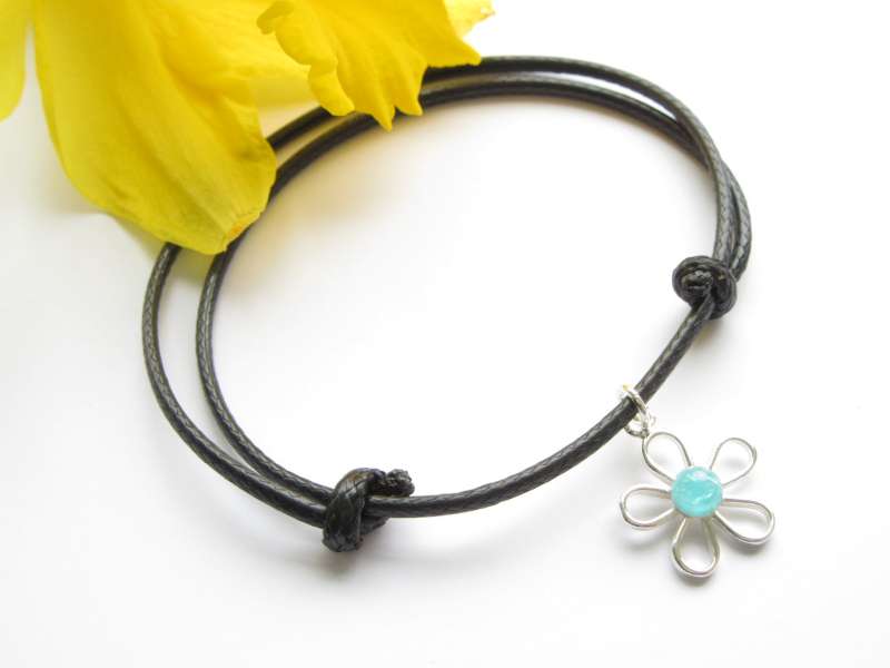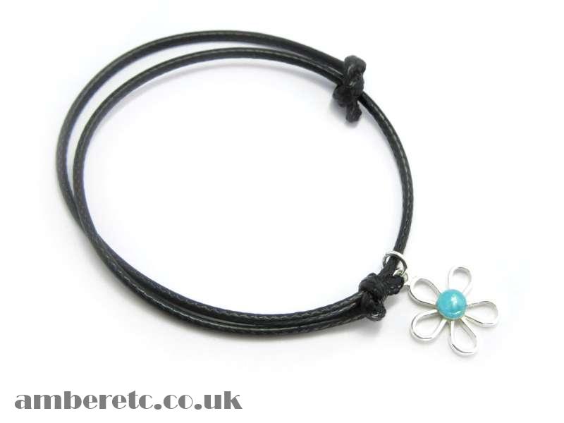 Girls' black decorative lace bracelet with a Sterling Silver Daisy with Blue Opal.