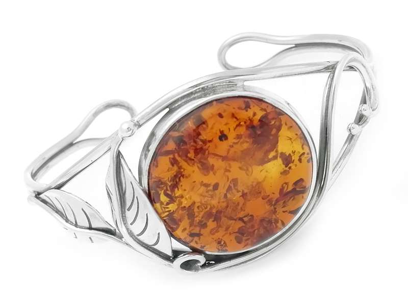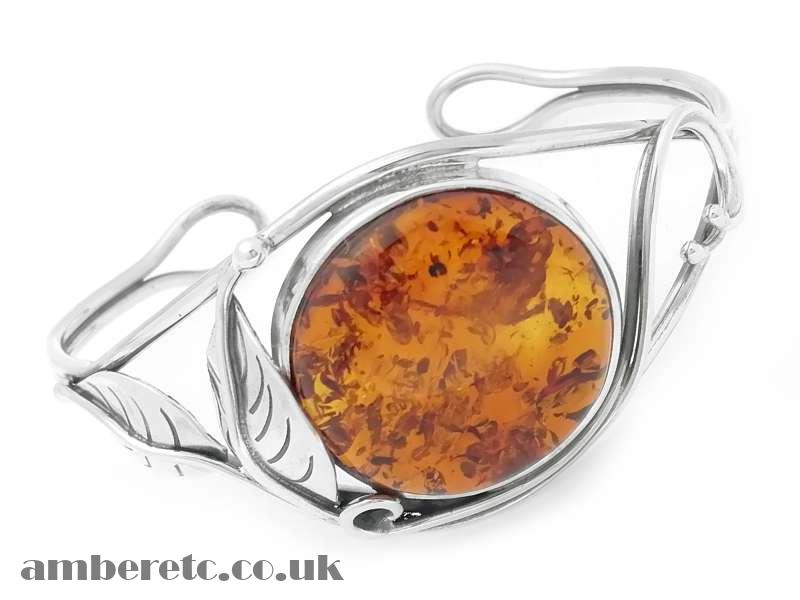 Beautiful silver bangle with floral lily art nouveau setting around a natural oval Baltic amber stone.