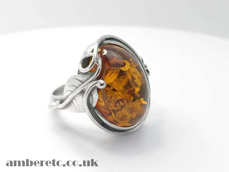 Beautiful, very large silver ring with a lily motif, Art-Nouveau setting around a natural oval Baltic amber stone.