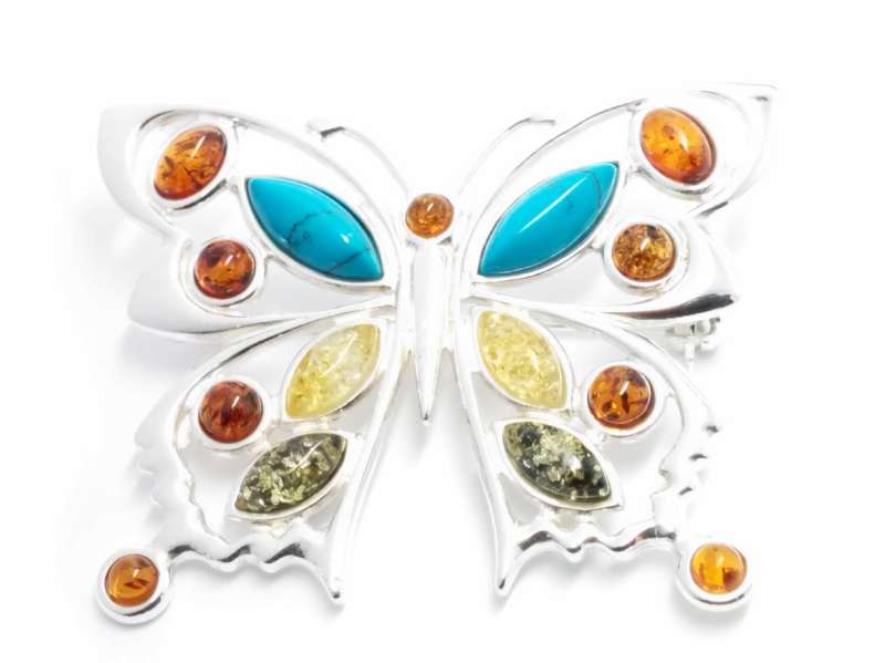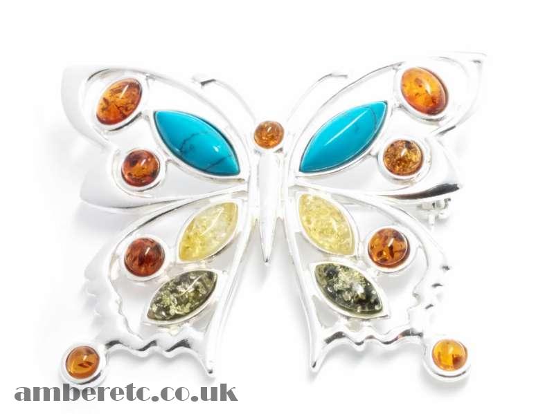 Beautiful 925 Sterling Silver Butterfly Brooch / Pendant with Multicoloured Baltic Amber and Turquoise.
