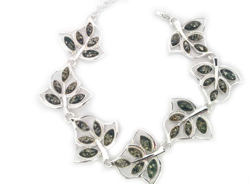Beautiful 925 Sterling Silver Large Leaf Bracelet with Natural Baltic Amber in Green.
