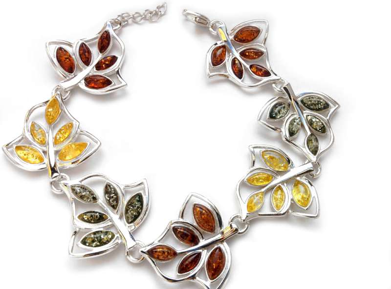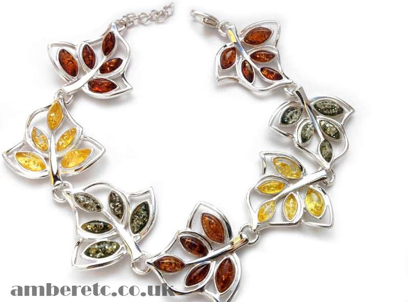Beautiful 925 Sterling Silver Large Leaf Bracelet with Natural Baltic Amber in Multicolour.