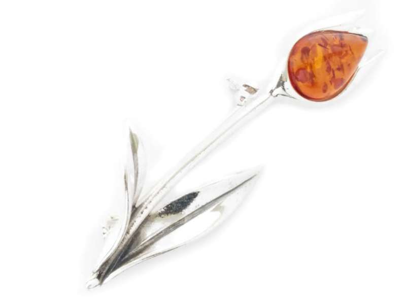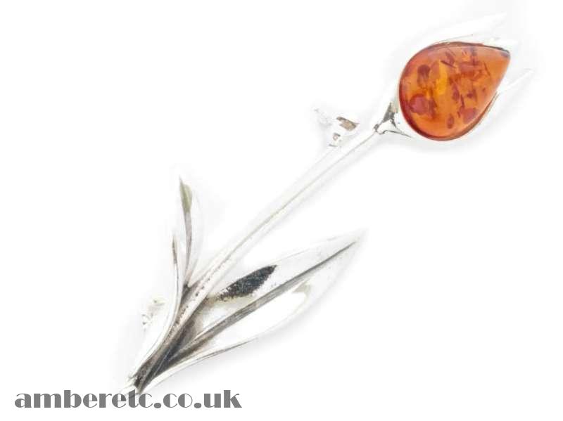 Beautiful 925 Sterling Silver Tulip Flower Brooch with Natural Baltic Amber.