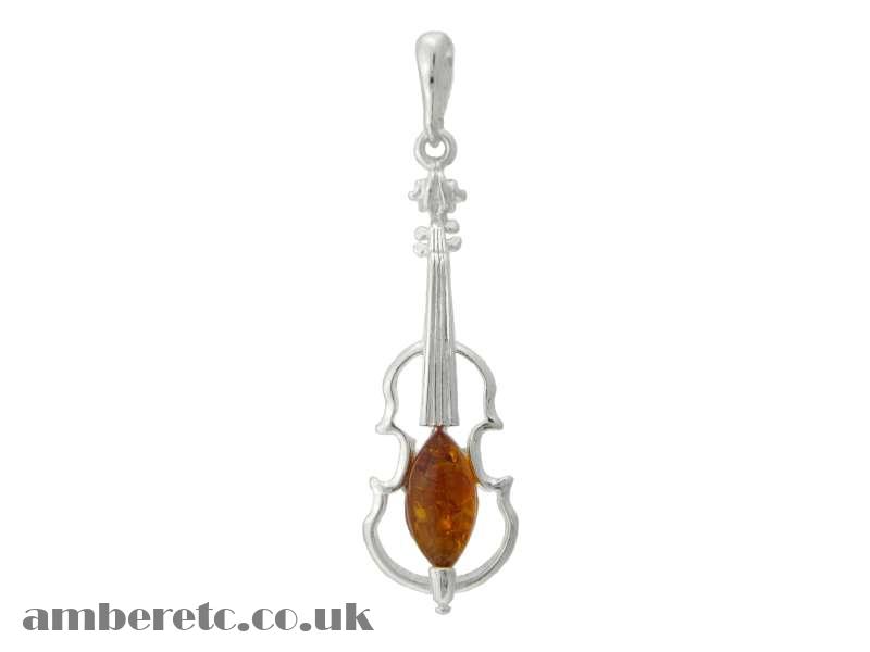 Beautiful 925 Sterling Silver Violin Pendant with Natural Baltic Amber.
