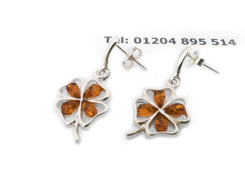 Beautiful 925 Sterling Silver Shamrock 4 Leaf Clover Earrings with Natural Baltic Amber.