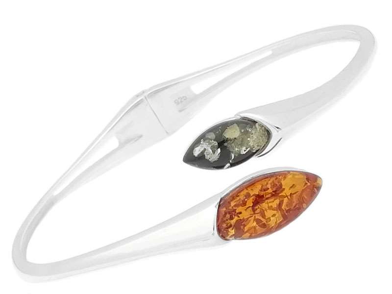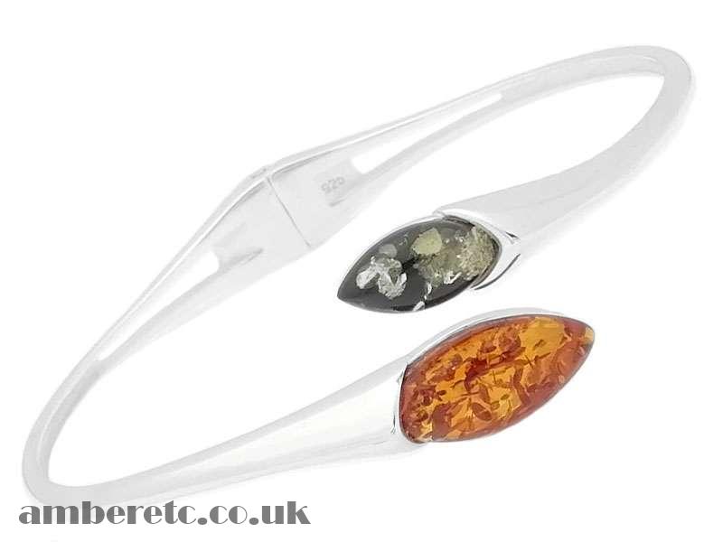 Beautiful silver bangle with two cognac amber marquise shape stones. Fitted with a spring mechanism for easy on and off.
