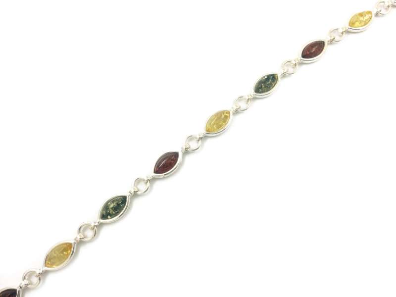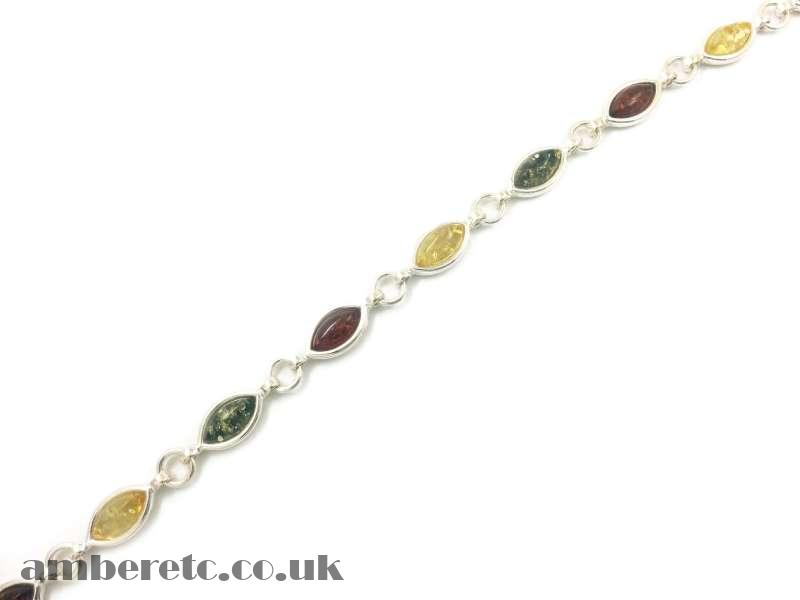 Beautiful 925 Sterling Silver Bracelet with Small Marquee Shaped Multicoloured Baltic Amber Stones.