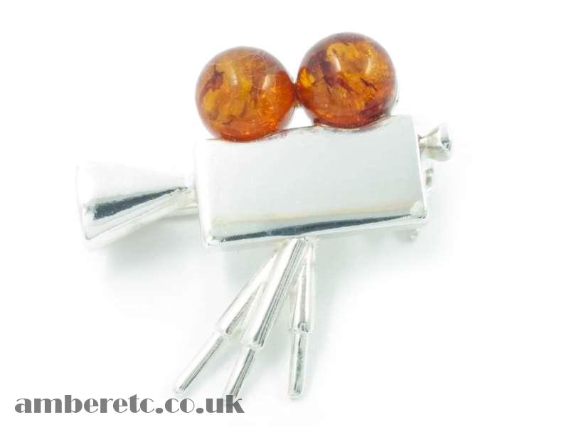 Beautiful 925 Sterling Silver Camera Brooch with Natural Baltic Amber.