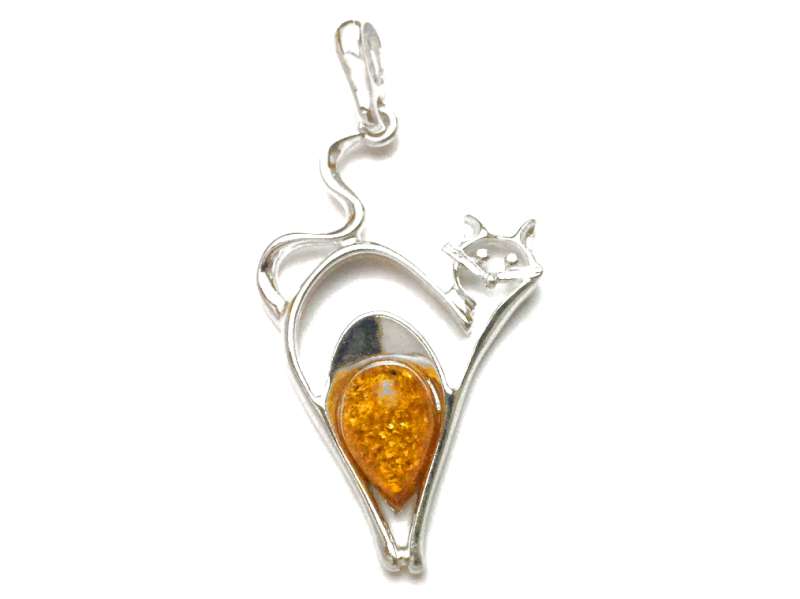Silver Cat Pendant with Amber