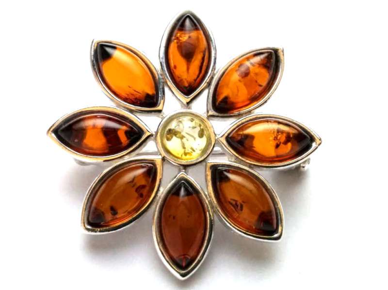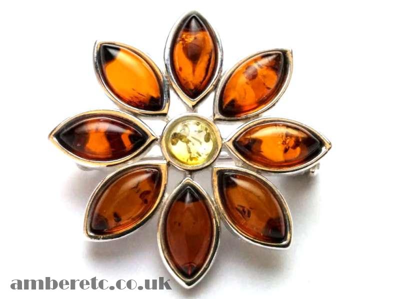 Beautiful 925 Sterling Silver Flower Brooch with Cognac and Yellow Amber.