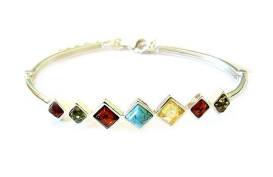 Stone arrangement: Cognac amber, yellow amber, green amber, and (RECO) Turquoise.