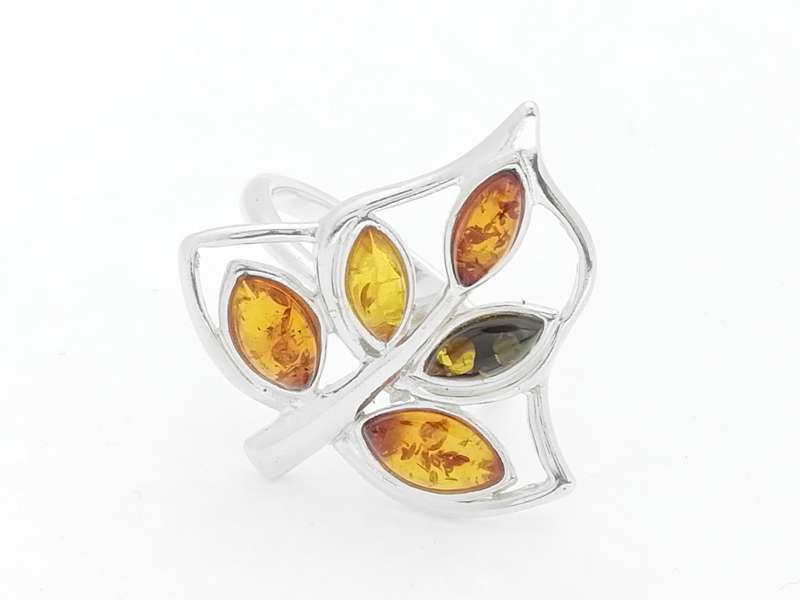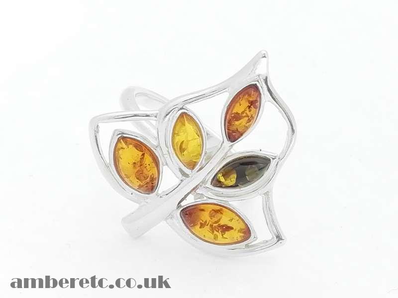 Beautiful 925 Sterling Silver Leaf Ring with Multicoloured Baltic Amber.