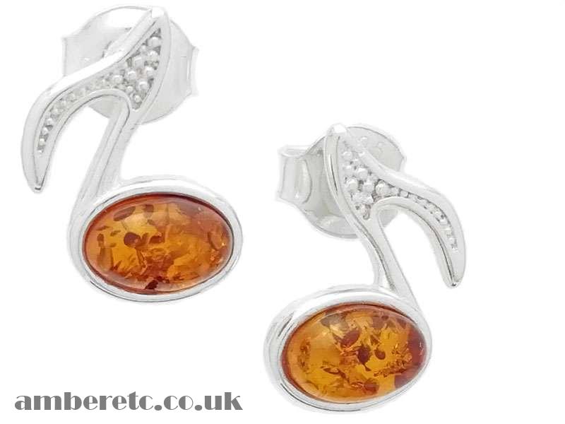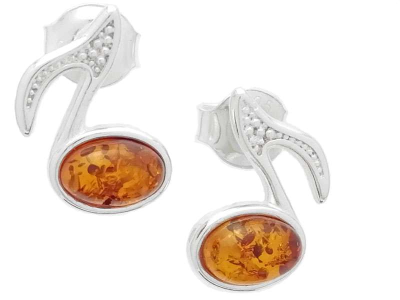 Beautiful 925 Sterling Silver Music Note Stud Earrings with Baltic Amber.
