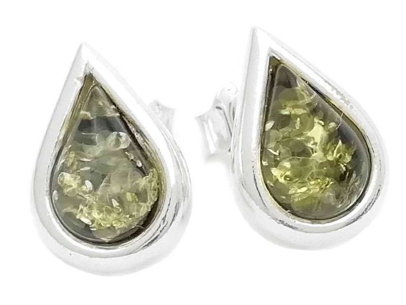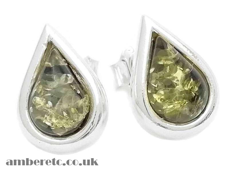 Beautiful 925 Sterling Silver Stud Earrings with Green Baltic Amber Teardrop.