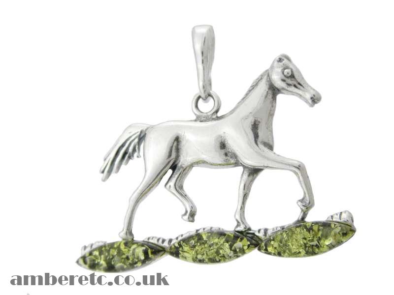 Beautiful 925 Sterling Silver Trotting Horse Pendant with Green Baltic Amber.