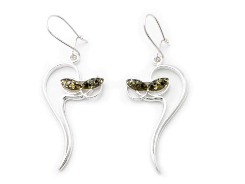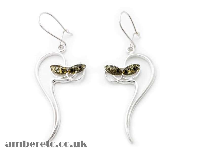 Beautiful 925 Sterling Silver Stretching Cat Earrings with Green Baltic Amber.