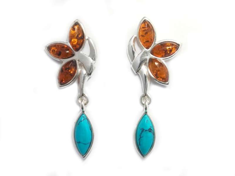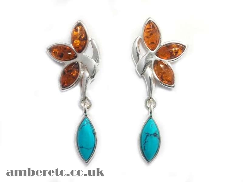 Beautiful 925 Sterling Silver Half Dragonfly Earrings with Natural Baltic Amber and Turquoise.