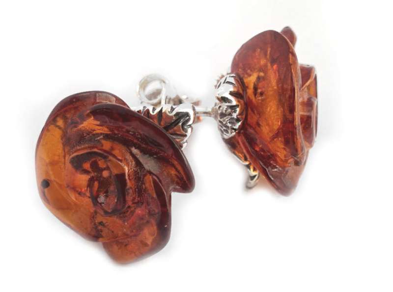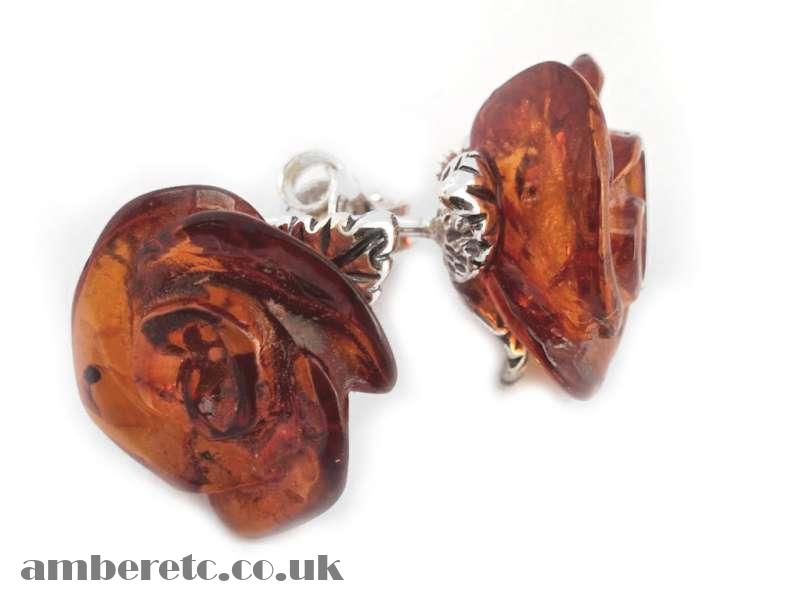 Beautiful 925 Sterling Silver Rose Stud Earrings with Natural Baltic Amber.