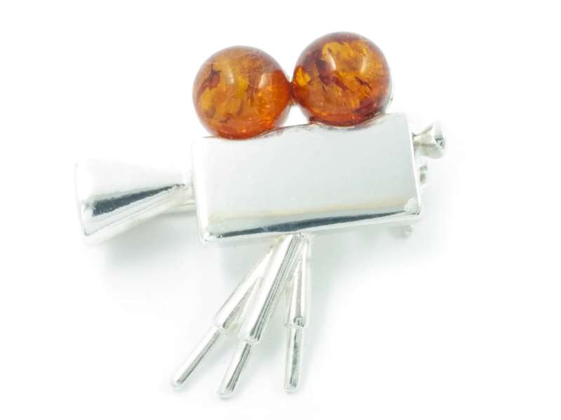 Beautiful 925 Sterling Silver Camera Brooch with Natural Baltic Amber.